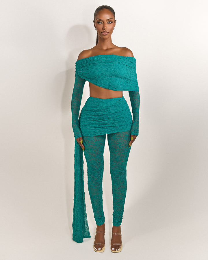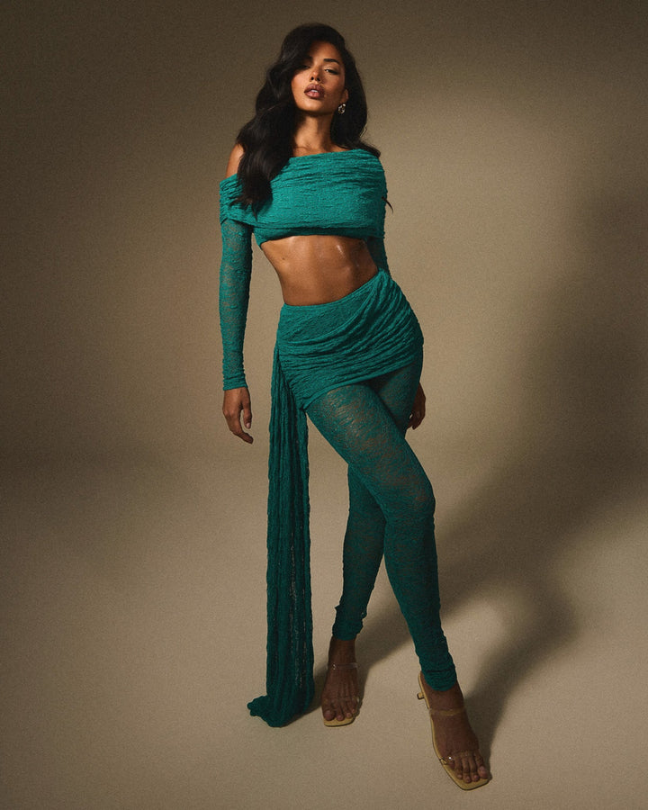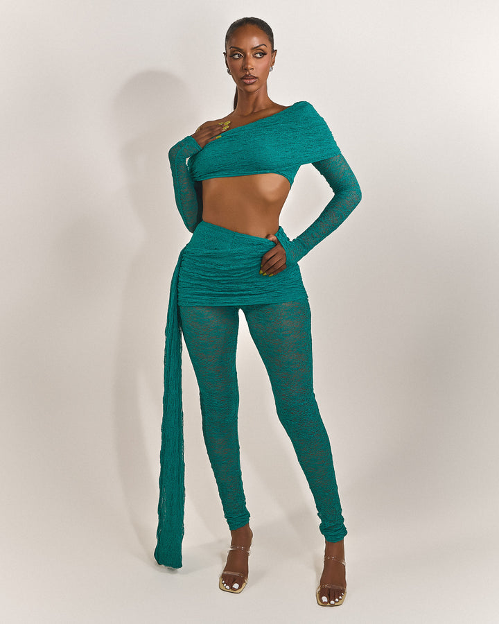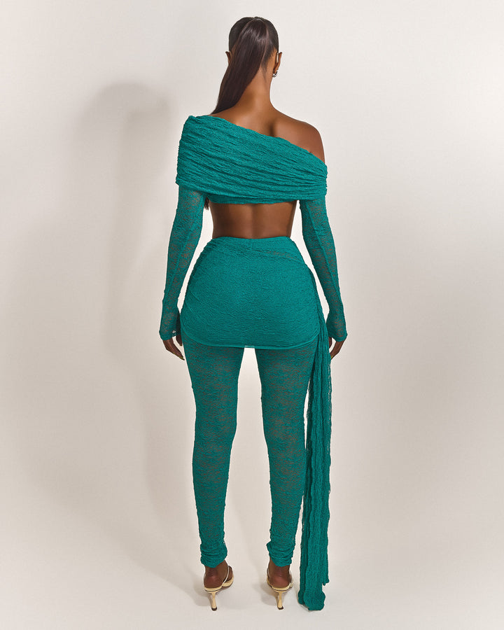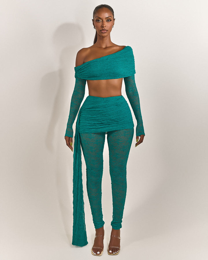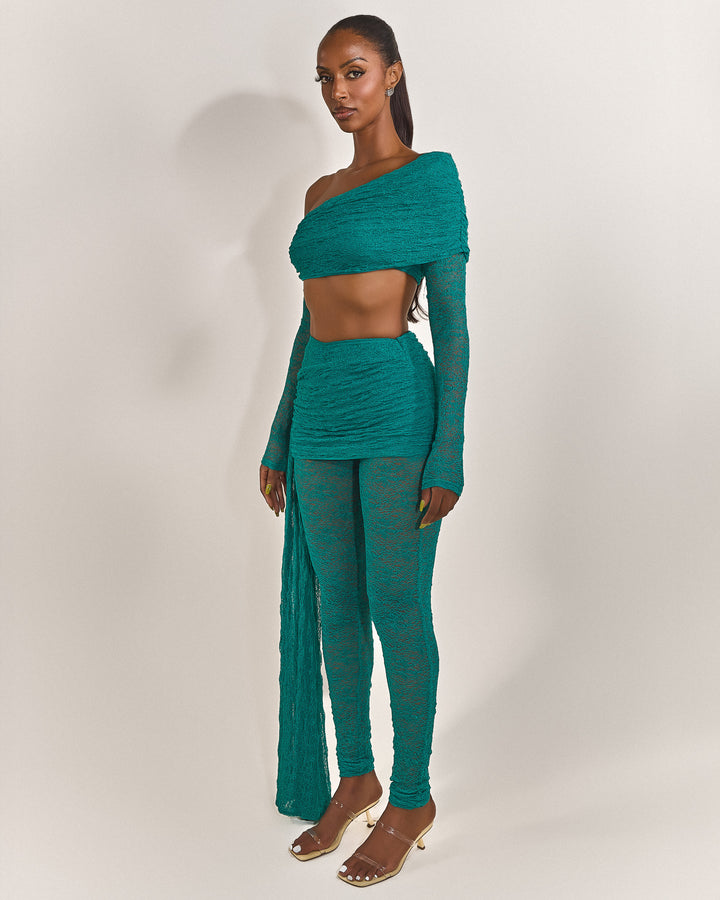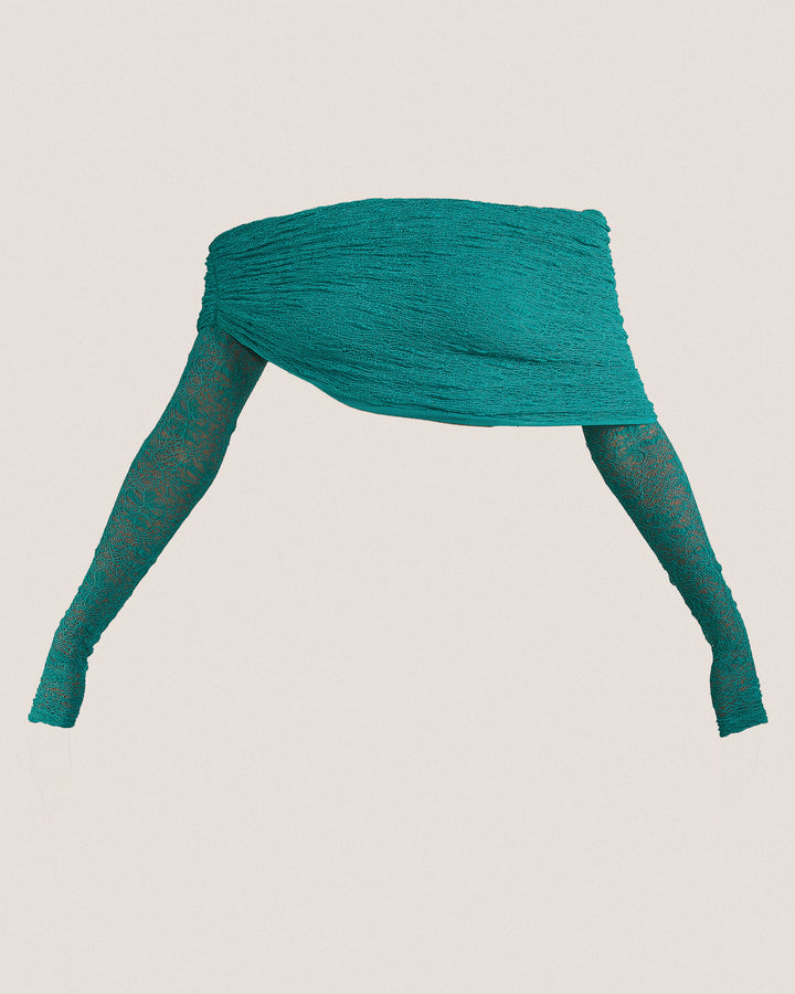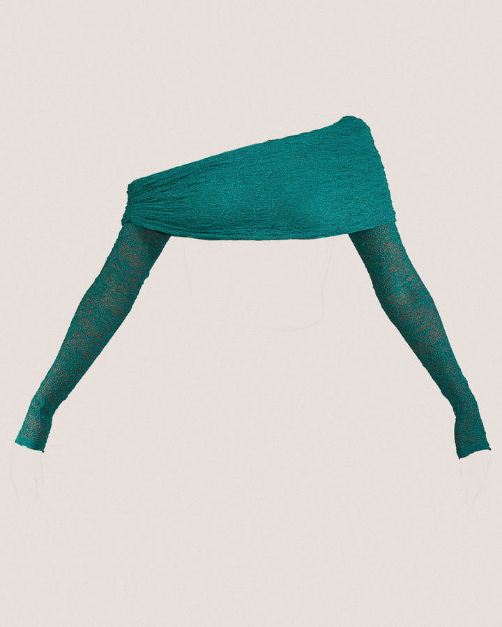 - Asymmetric one shoulder top with sheer lace sleeves. Customisable to be off the shoulder.