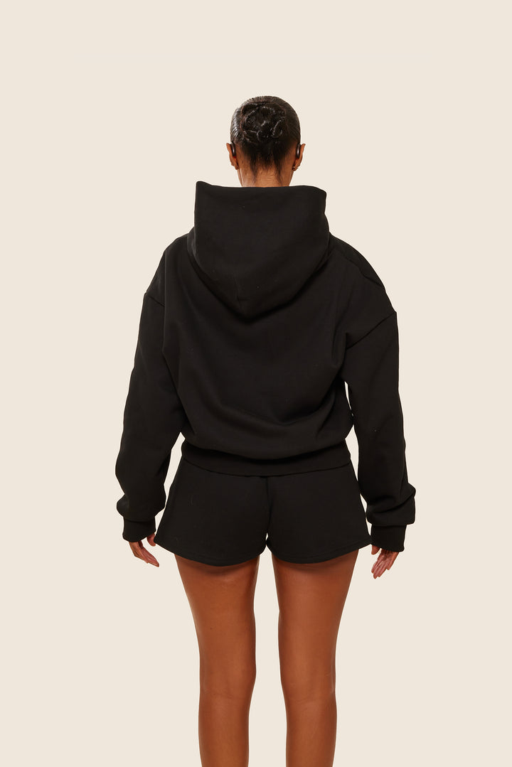 Model is 5"8 and wears a SMALL. Fits slightly oversized.